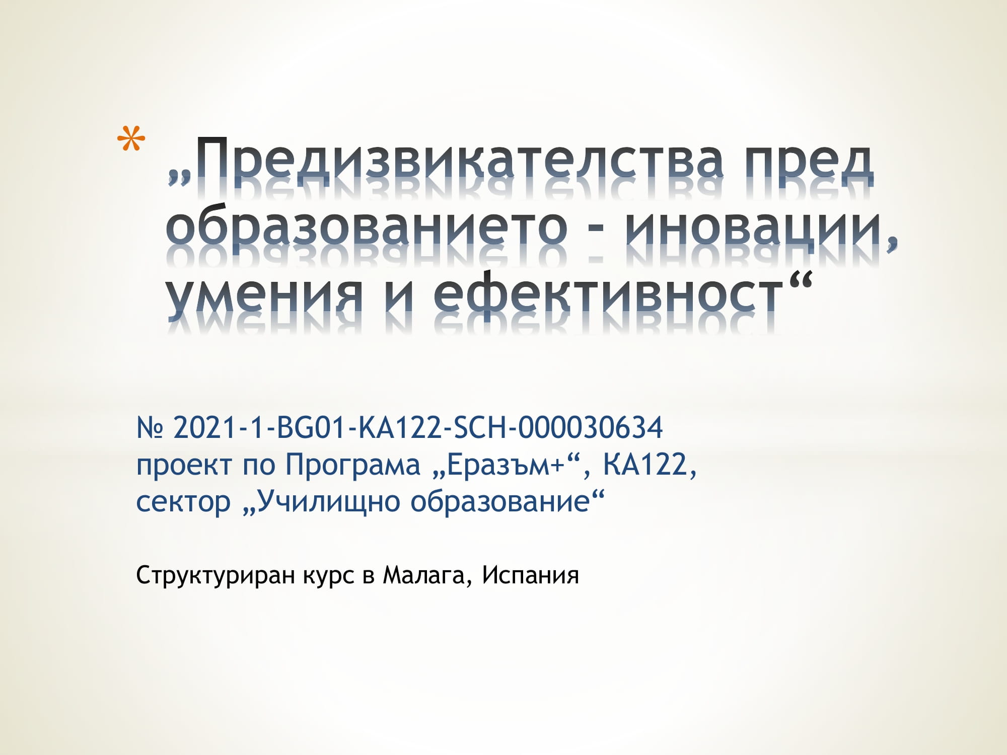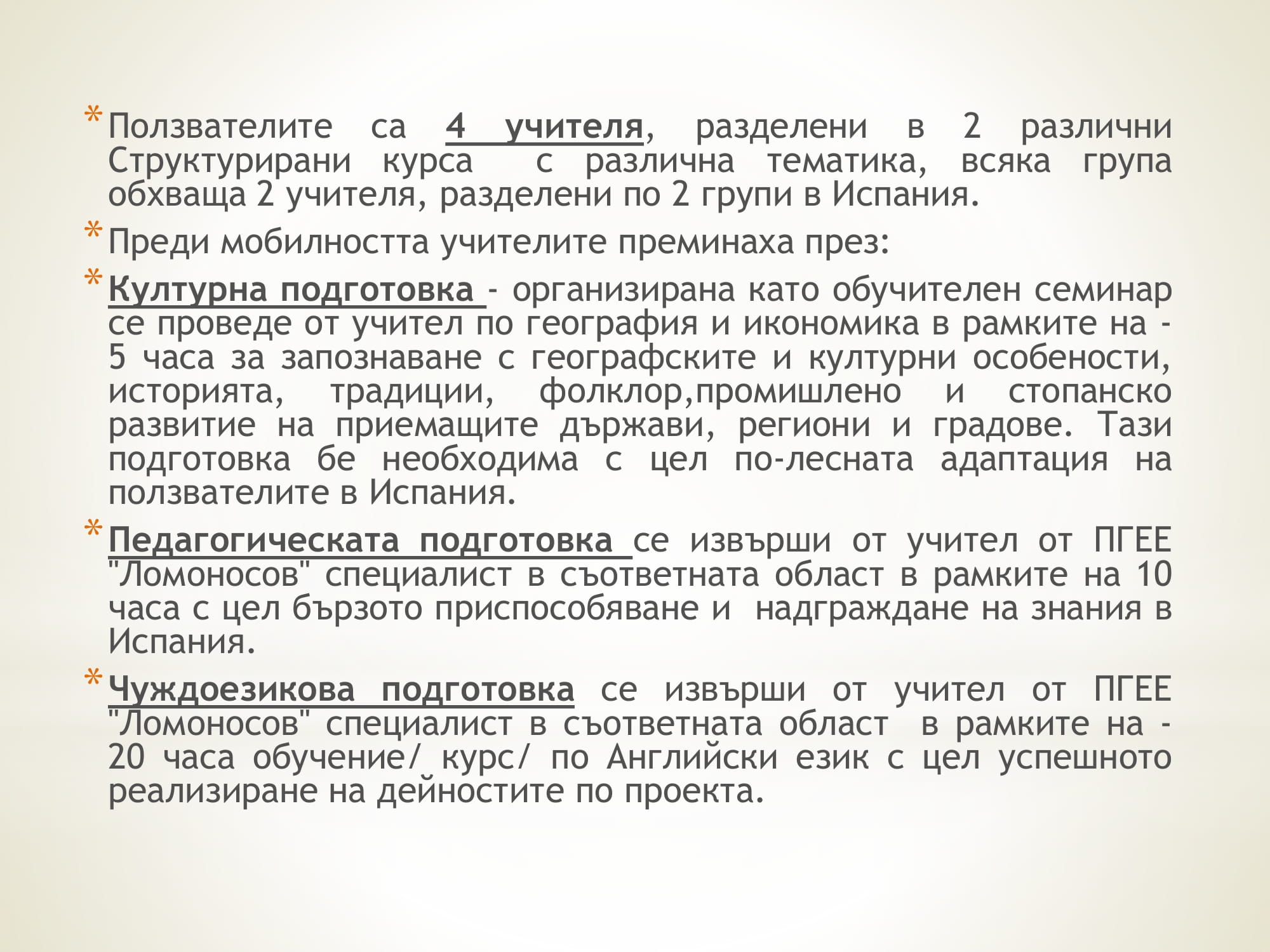 В рамките на една седмица(7 работни дни) по 6 часа на ден, в които учителите взеха участие в Структурирани курсове в Малага, Испания. По време на обучението учителите придобиха знания и умения, надградиха и получиха знания в области , които са нови за тях, но са необходими за всекидневната им работа, запознаха се с историята, културата и традициите в Испания.