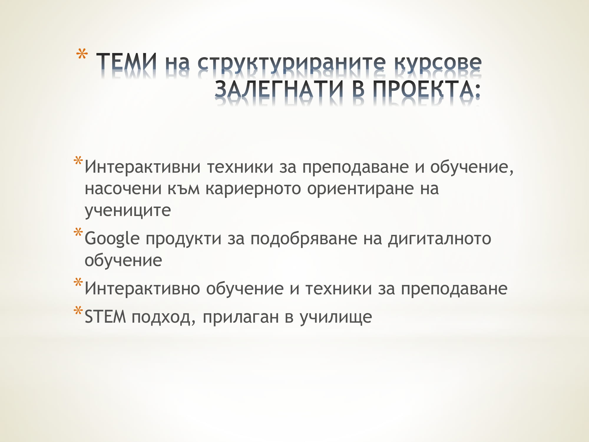 • Комплексен подход, заложен в обучението водещ до нови познания за управление и промяна на учебните програми