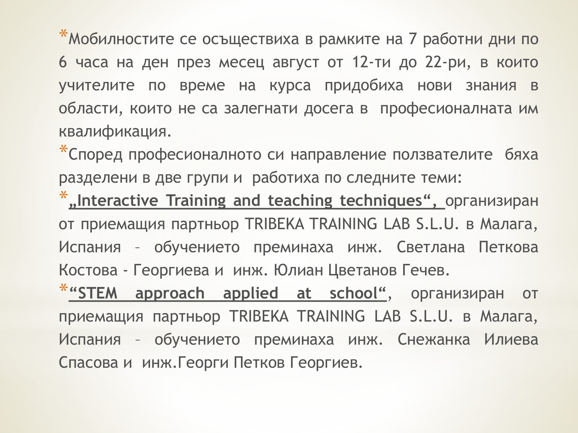 - „Interactive Training and teaching techniques“, организиран от приемащия партньор TRIBEKA TRAINING LAB S.L.U. в Малага, Испания – обучението преминаха инж. Светлана Петкова Костова - Георгиева и инж. Юлиан Цветанов Гечев