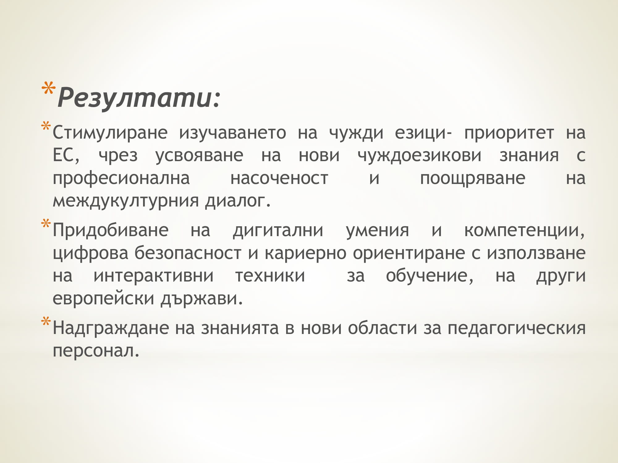 Проектът стимулира участниците да повишат знанията и уменията си, да придобият нови, да ги приложат в реална работна среда, да усъвършенстват и чуждоезиковите компетенции чрез пребиваване в Малага, Испания.